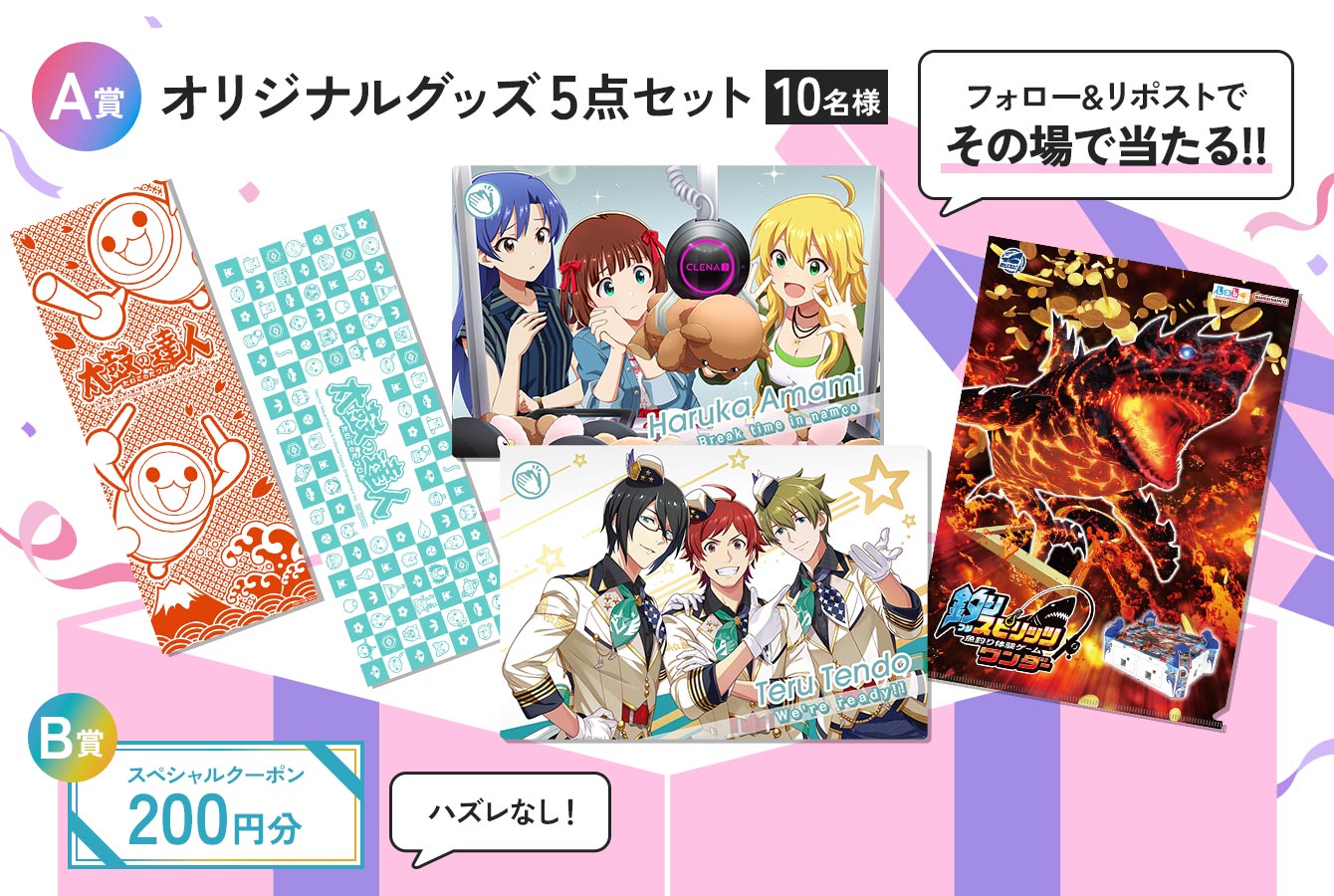 - ・本キャンペーンに関するお問い合わせは、下記のバンダイナムコアミューズメント公式サイト「お問い合わせフォーム」よりお願いいたします。