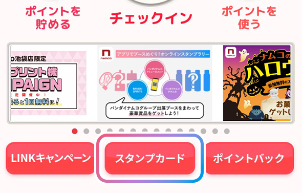 1ナムコポイントアプリをダウンロードし、トップ画面からスタンプカードを選択。