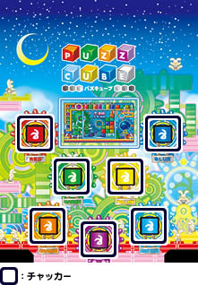 チャッカーにメダルが入ると、チャッカーと同じ色の射出口へストックされたキューブが運ばれます。