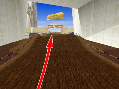 スタートはもちろんアクセル全開で。 スタートしてからある程度速度がのるまではなるべくバイクを倒さないようにし、第1コーナーでインをつくことよりもジャンプ直前の速度を優先すること。 速度はジャンプ直前で104km/hを目標に。 | |