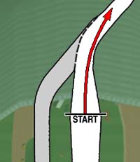 第2コーナーの脱出速度が充分に高ければ、ウォッシュボードはリズムよく二つづつ飛ぶことができ、空中での速度も100km/hを下回ることはないだろう。 右側のラインを直線的に走行しよう。 |