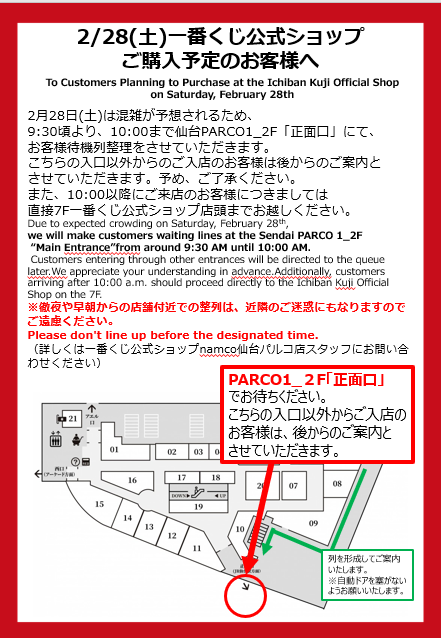 2月28日(土)は混雑が予想されるため、9:30頃より、10:00まで仙台PARCO1_2F【正面口】にて、お客様待機列整理をさせていただきます。