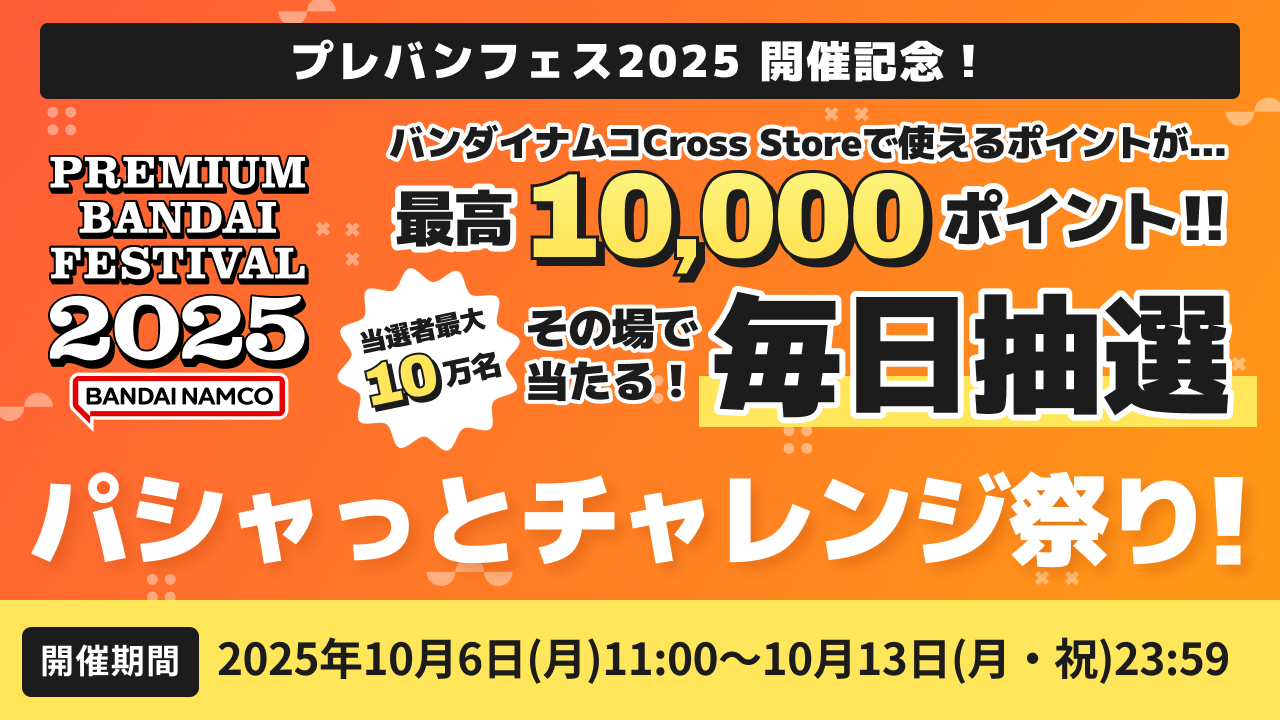 バンダイナムコ Cross Storeやバンダイナムコの各種オフィシャルショップなど対象店舗のお買い物で使えるポイントが、 最高10,000ポイント ・ 当選者数最大10万名 にあたる「パシャっとチャレンジ祭り!」を開催いたします。