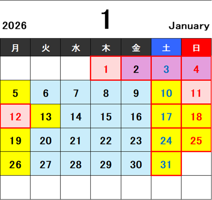 カレンダー赤枠の箇所はオープンが早くなる日です。