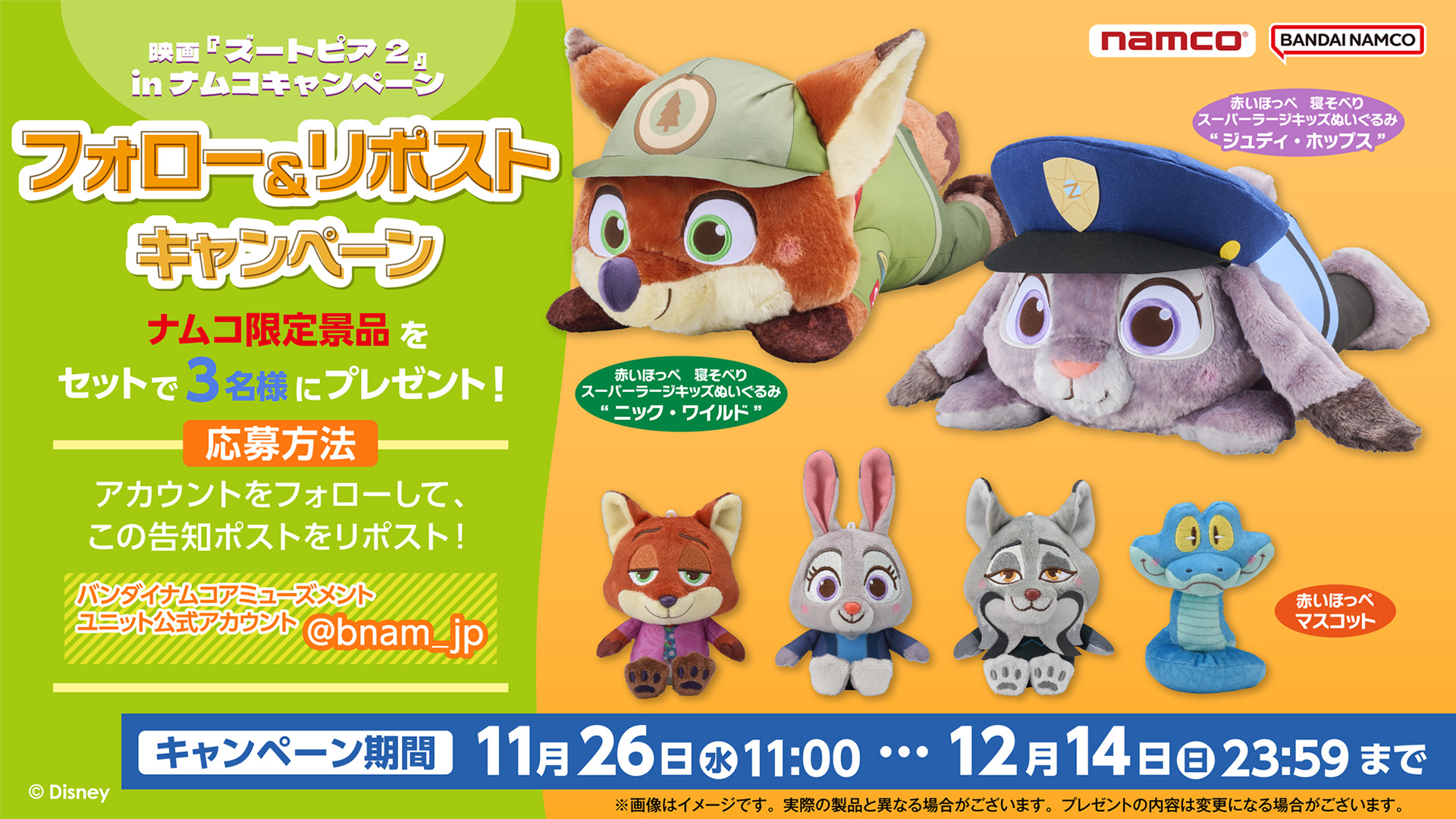 株式会社バンダイナムコエクスペリエンス(以下、当社といいます。)は、映画『ズートピア2』in ナムコキャンペーン(以下、本キャンペーンといいます。)の実施にあたり、本キャンペーンの応募規約(以下、本規約といいます。)を以下のとおり定めます。