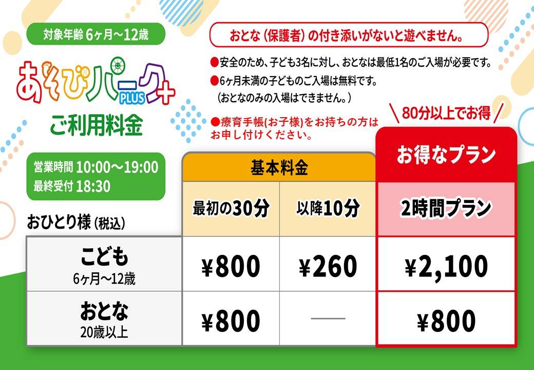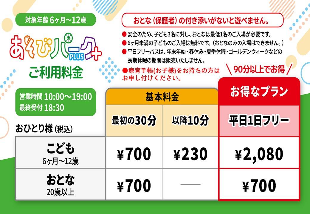 ※あそびパークPLUSは10:00~19:00(最終受付18:30)