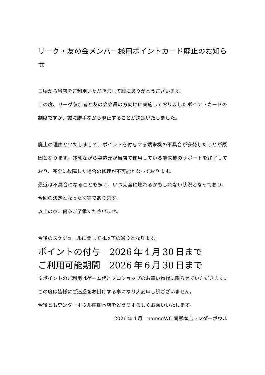 【お知らせ】リーグ・友の会メンバー様用ポイントカード廃止のご案内