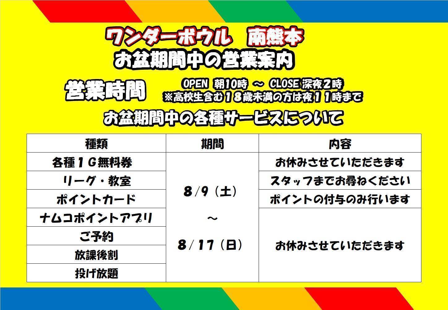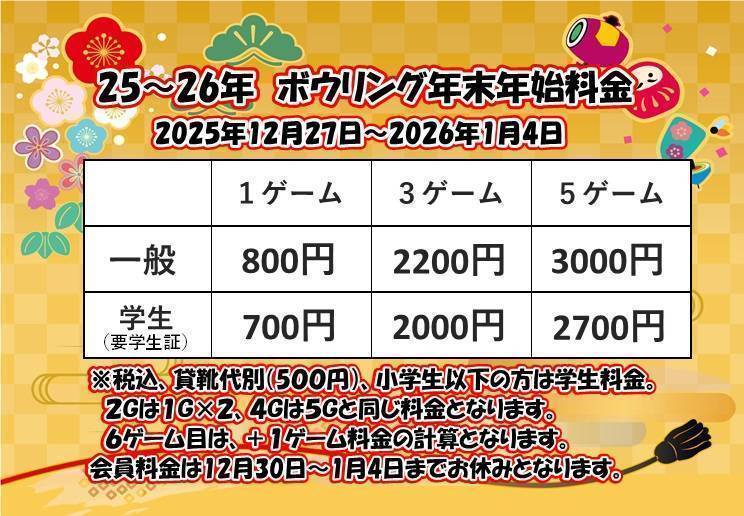 namcoワンダーシティ南熊本店【ボウリング】年末年始(12/27~1/4)の営業について 2025.12.05 ボウリングコーナーの年末年始(12/27~1/4)のご案内です。 各種サービスの制限と年末年始料金のお知らせになります。 詳しくは画像をご覧ください。