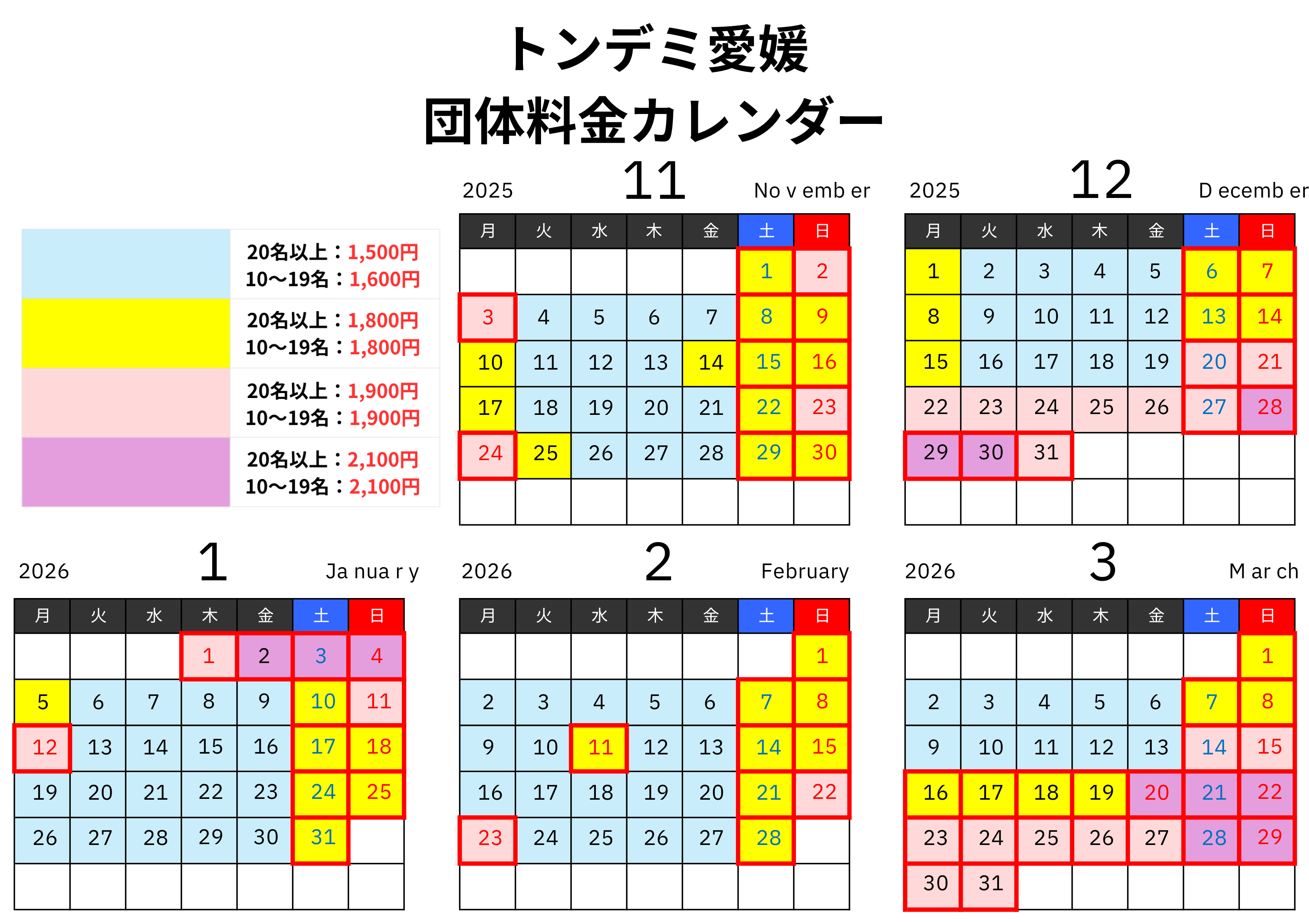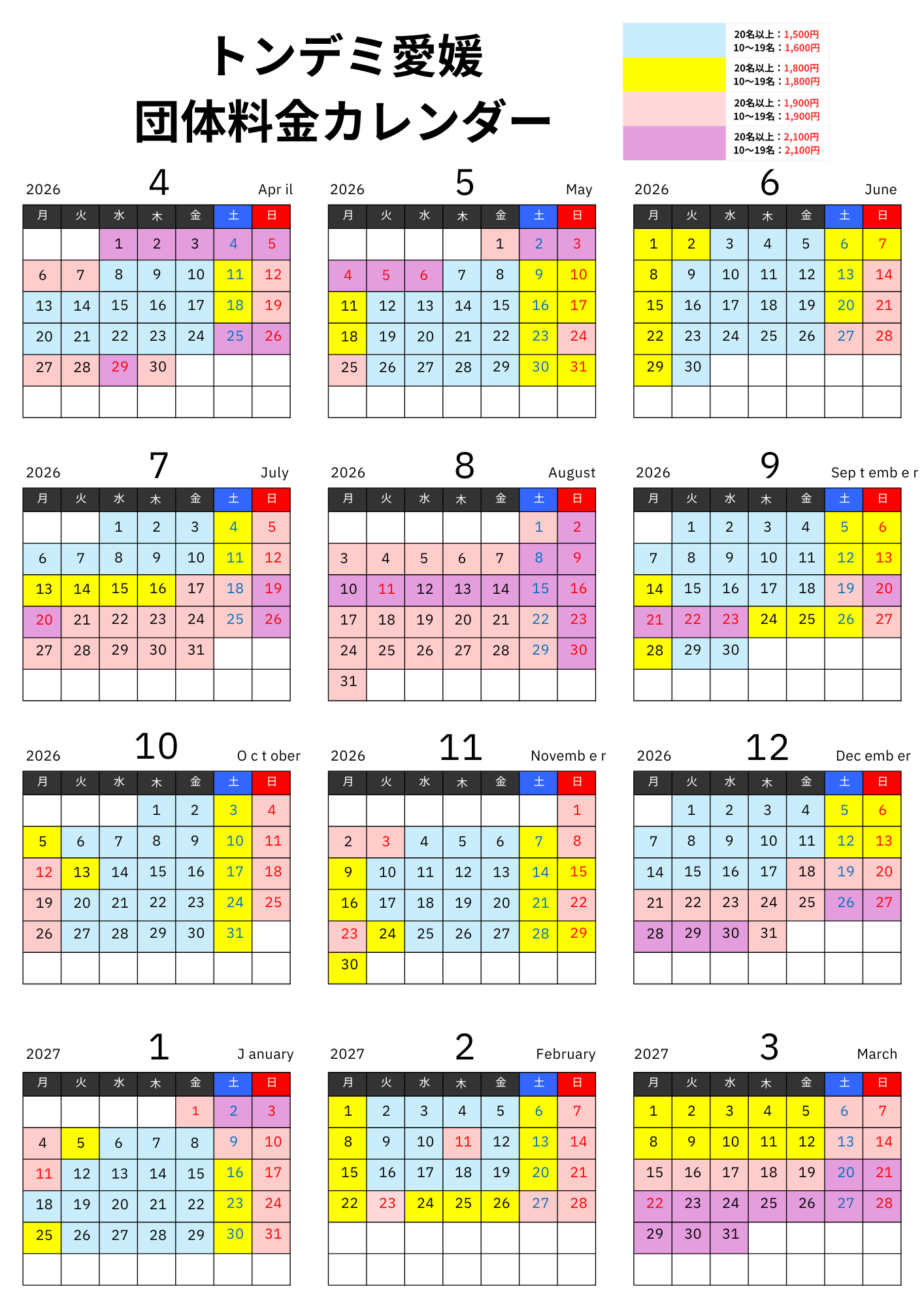 26年度のトンデミ愛媛団体料金は以下記のカレンダー通りです。