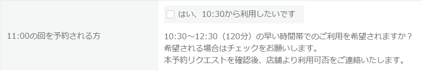 ※『申込フォームはこちら❷』で10:30~の回で利用希望の方は、11:00の回の予約枠に入っていただき、下記項目にチェックをお入れください。