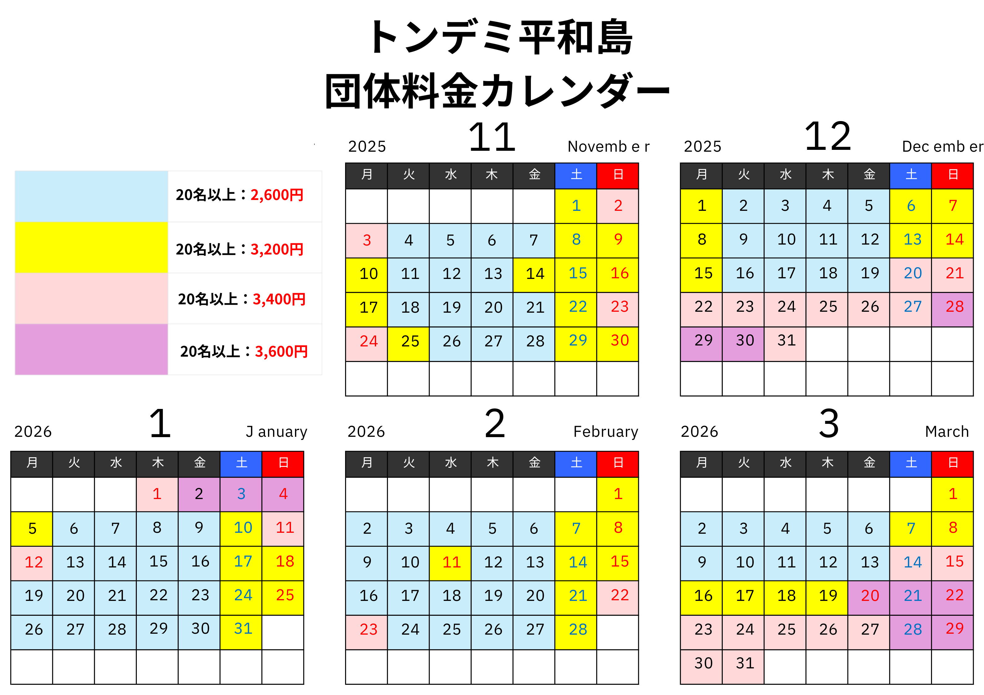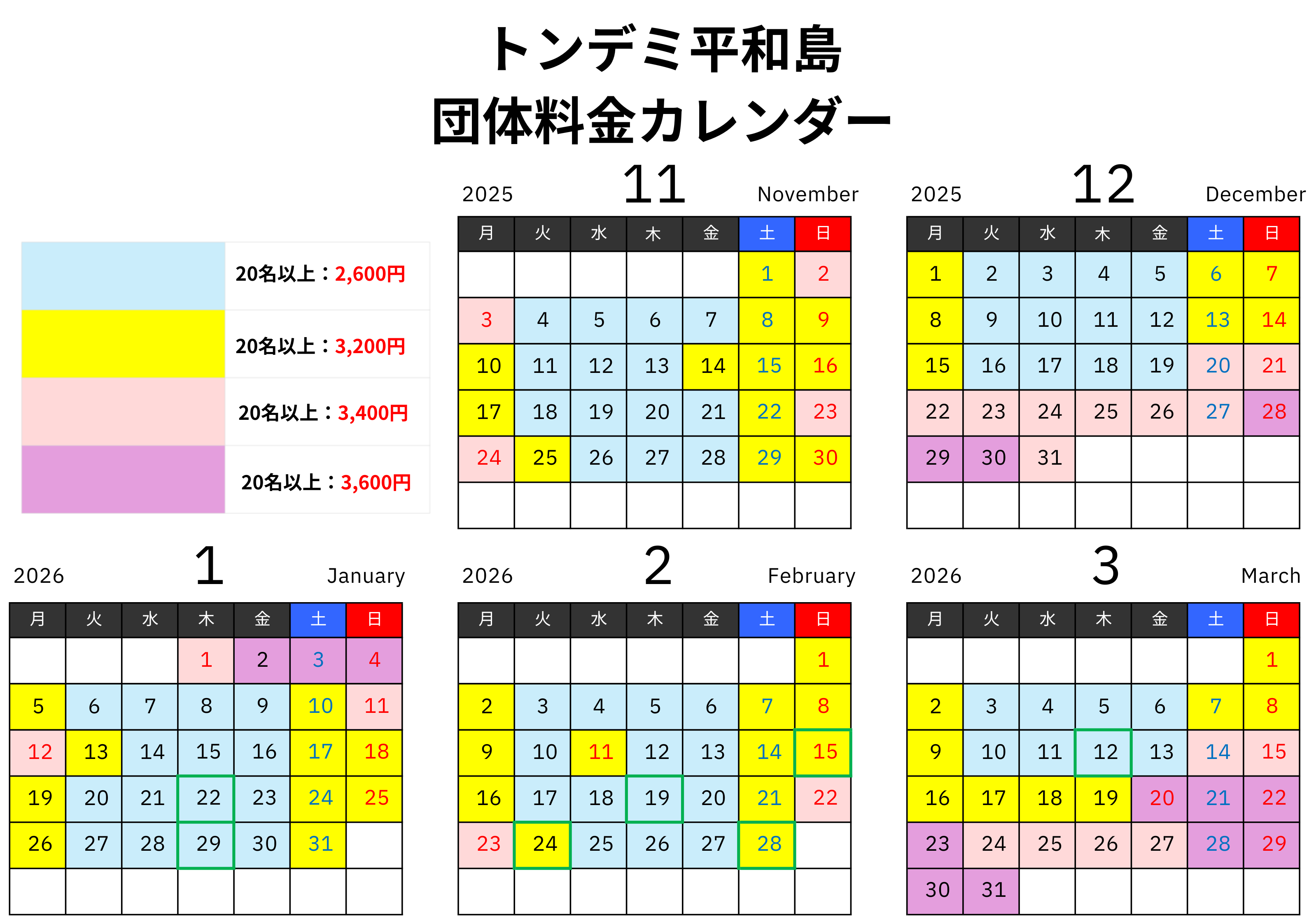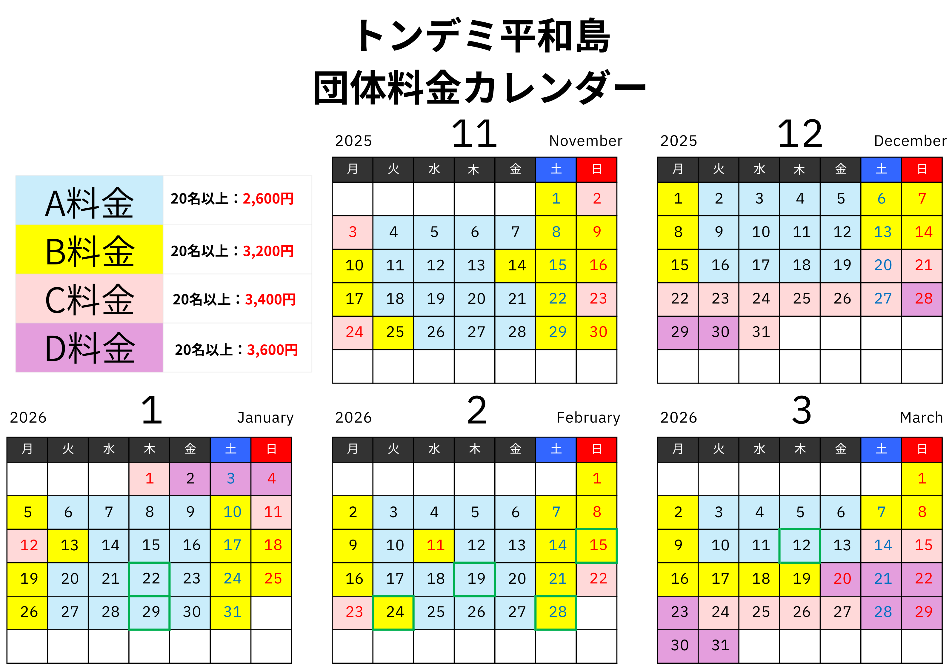 トンデミ平和島 HOME ニュース 施設紹介 料金案内 アクセス よくあるご質問 ニュース トンデミ平和島 最新ニュース 団体料金カレンダー トンデミ平和島の団体料金は以下記のカレンダー通りです。2026年4月以降の団体料金については決まり次第表示いたします。 トンデミ平和島 ニュース一覧 お得なWEBチケット販売中 お得なWEBチケット販売中