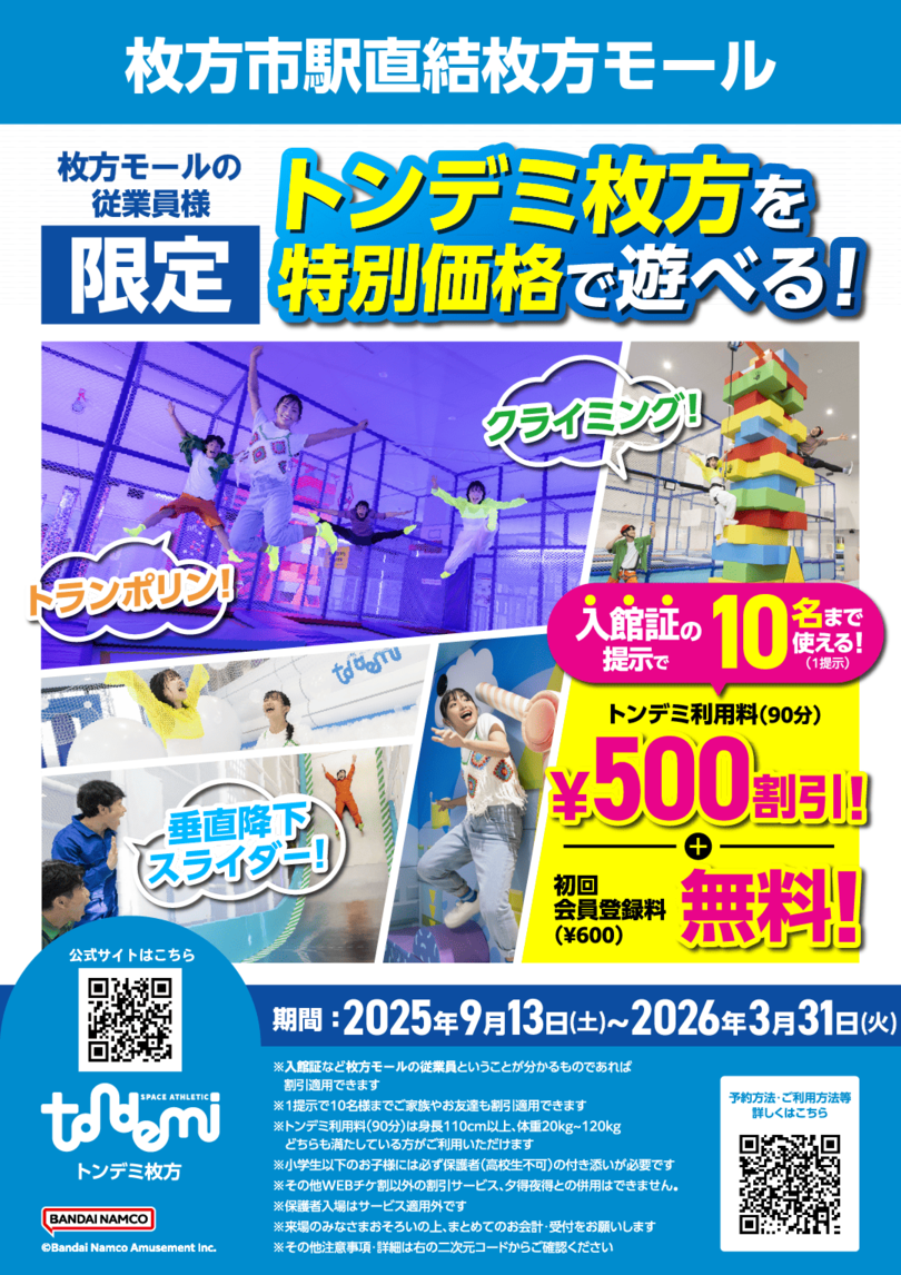 枚方モールの従業員様限定!トンデミ枚方を特別価格で遊べる!