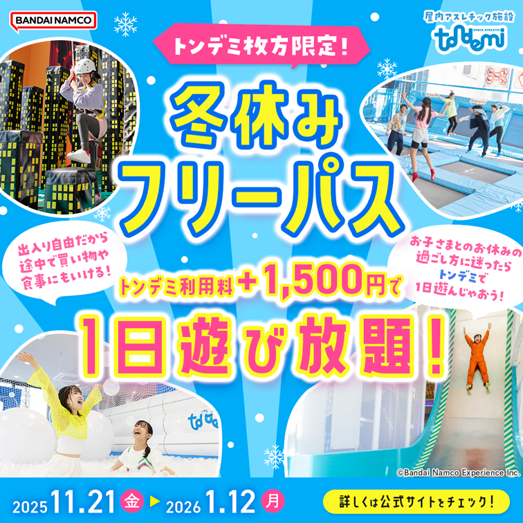 トンデミ枚方では、通常90分のトンデミ利用が、1日遊び放題になるお得な「冬休みフリーパス」を販売!