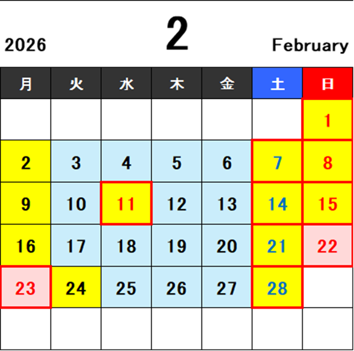 カレンダー赤枠の箇所はオープンが早くなる日です。