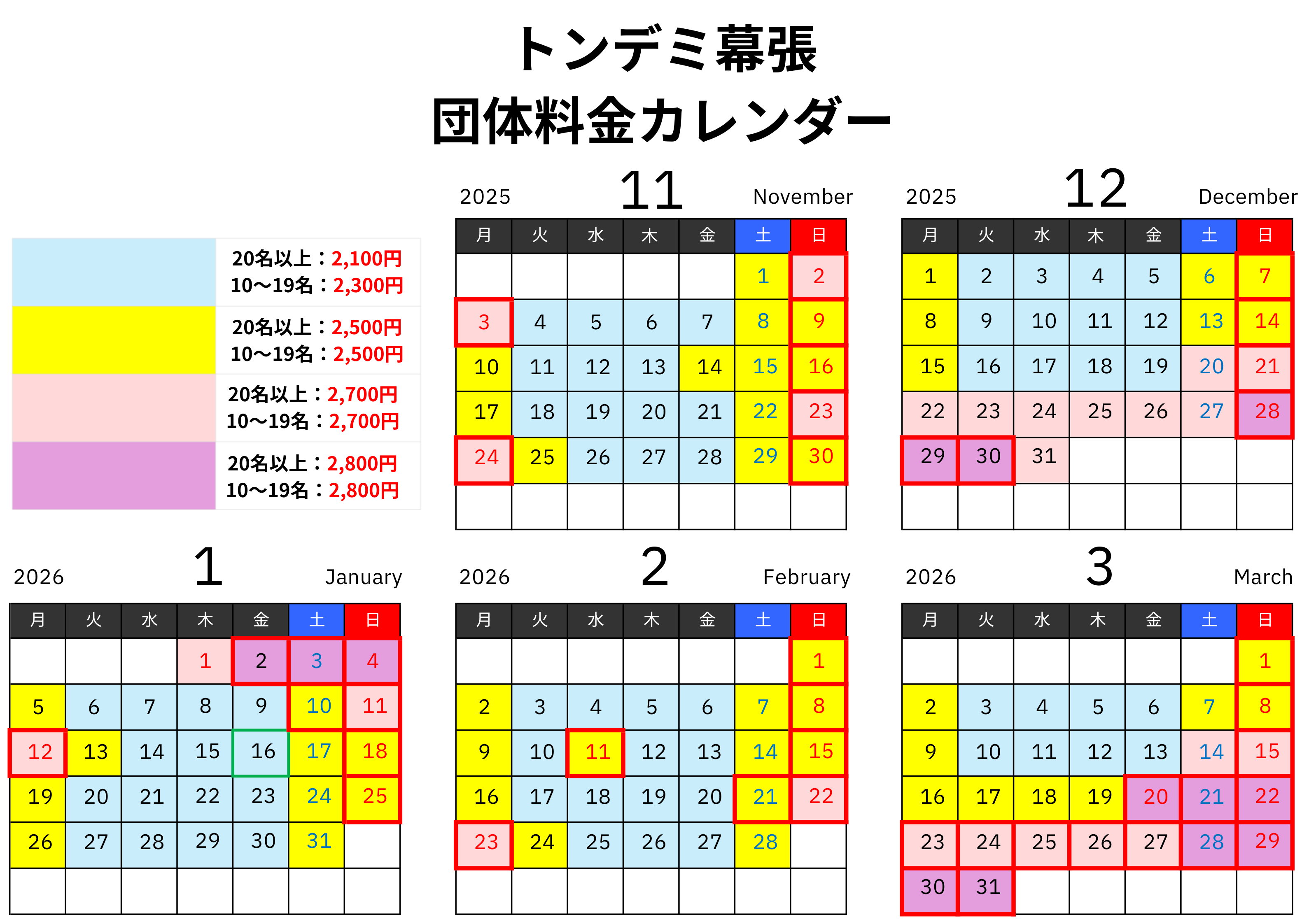 トンデミ幕張 HOME ニュース 施設紹介 料金案内 アクセス よくあるご質問 ニュース トンデミ幕張 最新ニュース 団体料金カレンダー トンデミ幕張の団体料金は以下記のカレンダー通りです。2026年4月以降の団体料金については決まり次第表示いたします。 トンデミ幕張 ニュース一覧 お得なWEBチケット販売中 お得なWEBチケット販売中