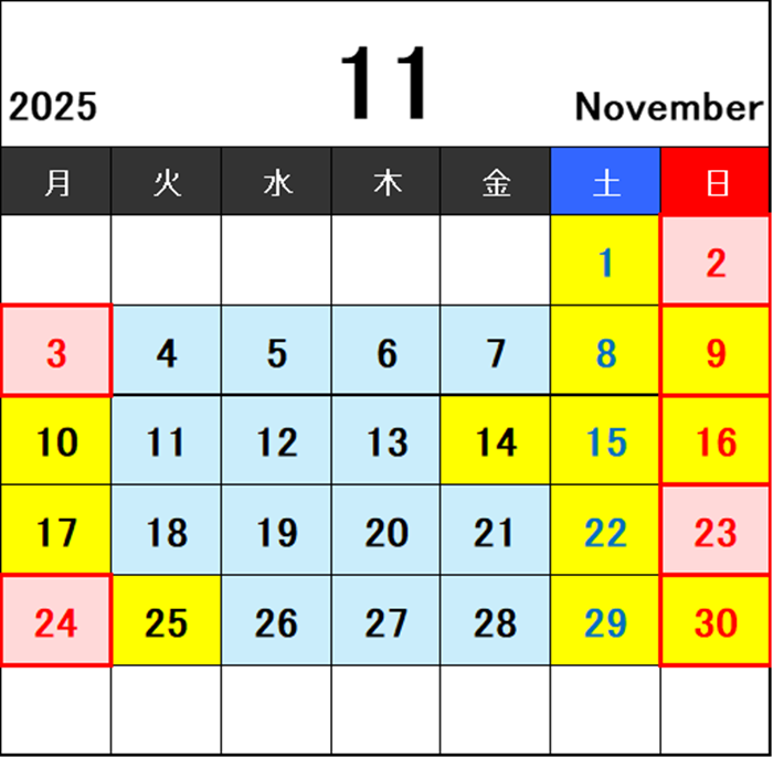 カレンダー赤枠の箇所はオープンが早くなる日です。