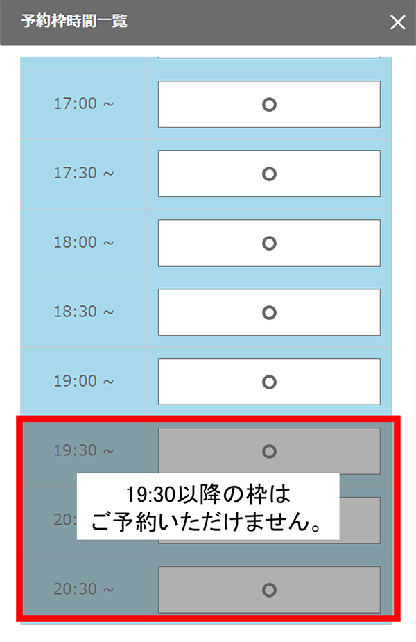 下記画像の通り、赤枠内17:30以降の枠はご予約ができません。