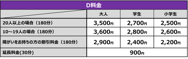 ・団体割引は当日受付を行っておりません。事前予約のない場合は上記人数でお越しいただいても団体料金にはなりません。