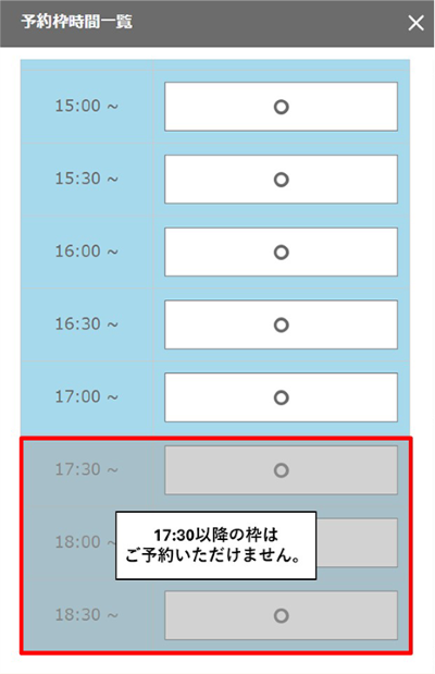 下記画像の通り、赤枠内17:30以降の枠はご予約ができません。