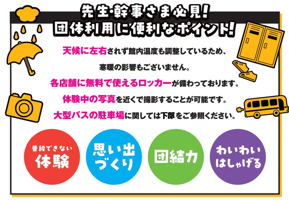 学校の遠足や修学旅行での利用はもちろん、新年会や子ども会やサークル、スポーツクラブや企業のイベントの親睦会にもおすすめ!