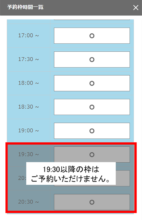 下記画像の通り、赤枠内19:30以降の枠はご予約ができません。
