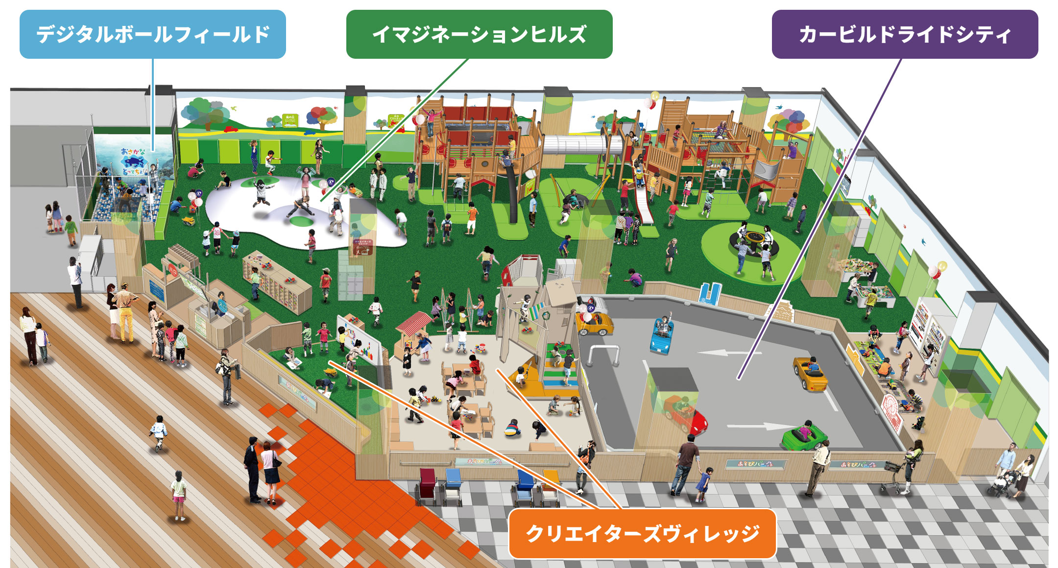 風の丘やアスレチックで身体を動かして楽しめる「イマジネーションヒルズ」、おままごとやお絵かきを楽しめる「クリエイターズヴィレッジ」など、4つのエリアがあります。