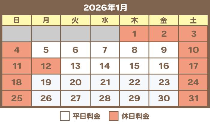 冬休み期間として全日程“休日料金”でのご案内となります。