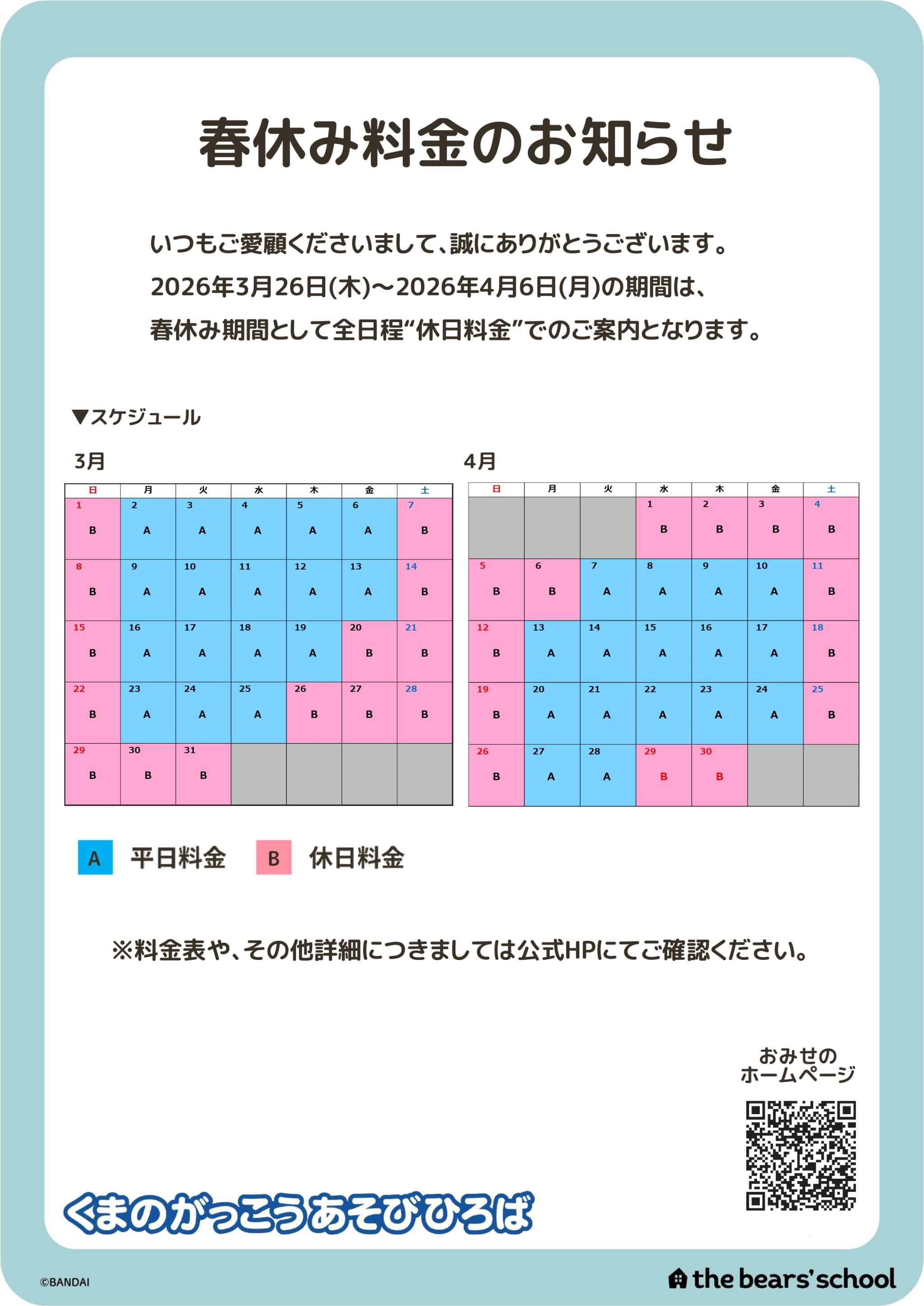 3/26(木)~春休み料金のお知らせ