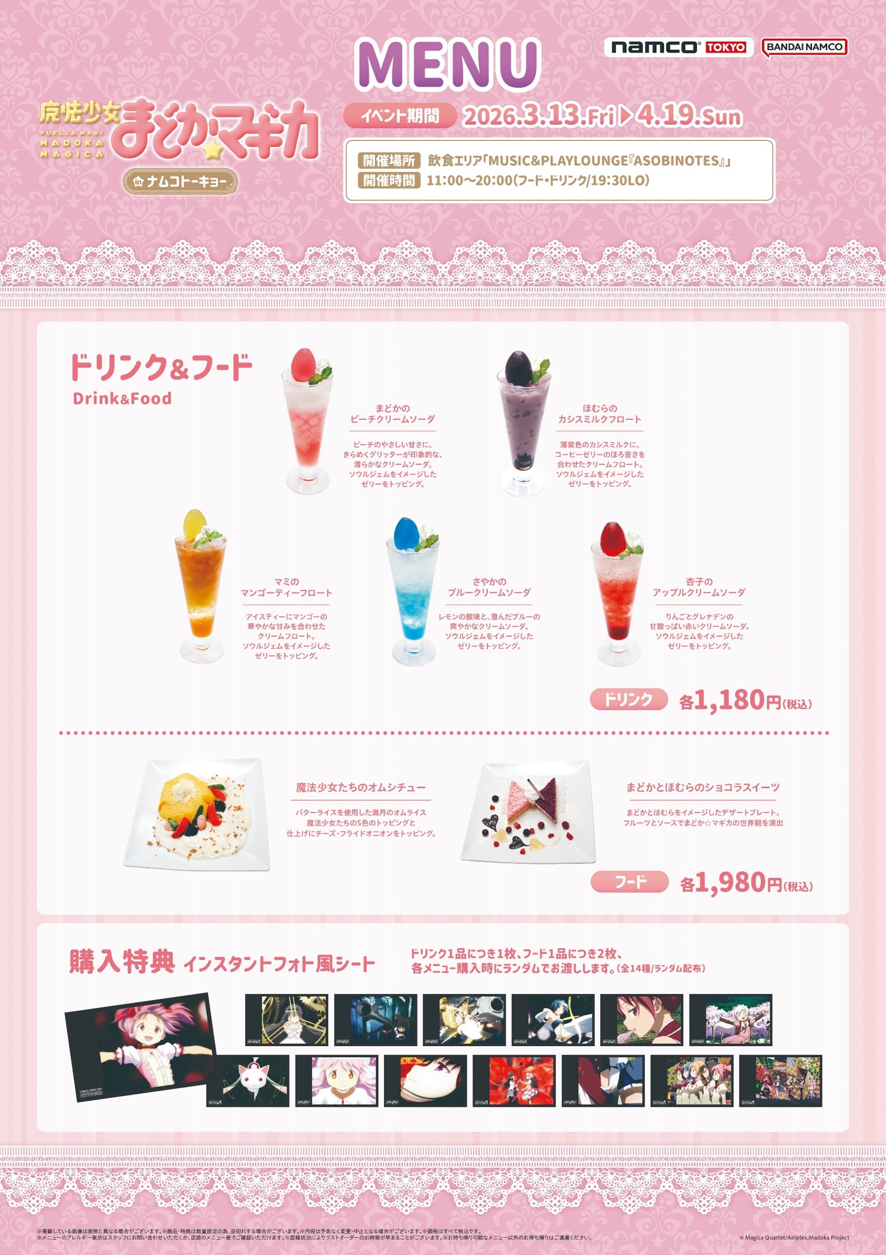 魔法少女たちをイメージしたドリンクやフードの他、購入特典としてインスタントフォト風シート(全14種)をランダムで配布します!