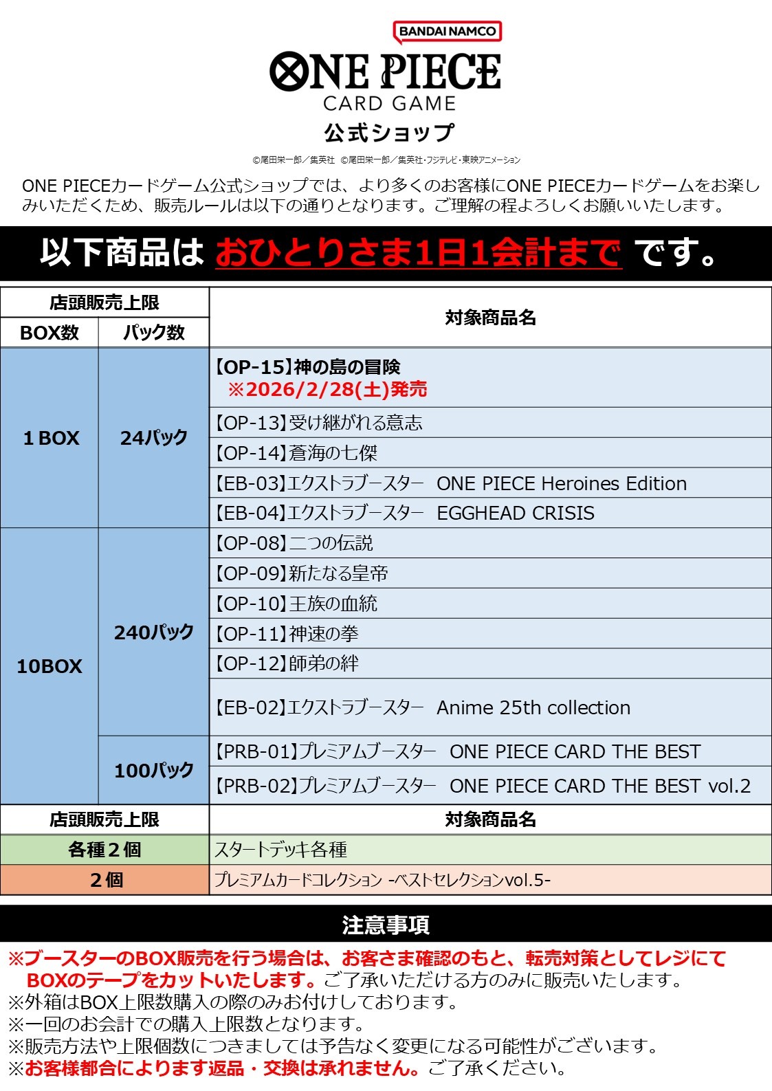 より多くのみなさまにお楽しみいただけるよう、ONE PIECEカードゲーム公式ショップでは一部商品に購入制限を設けております。