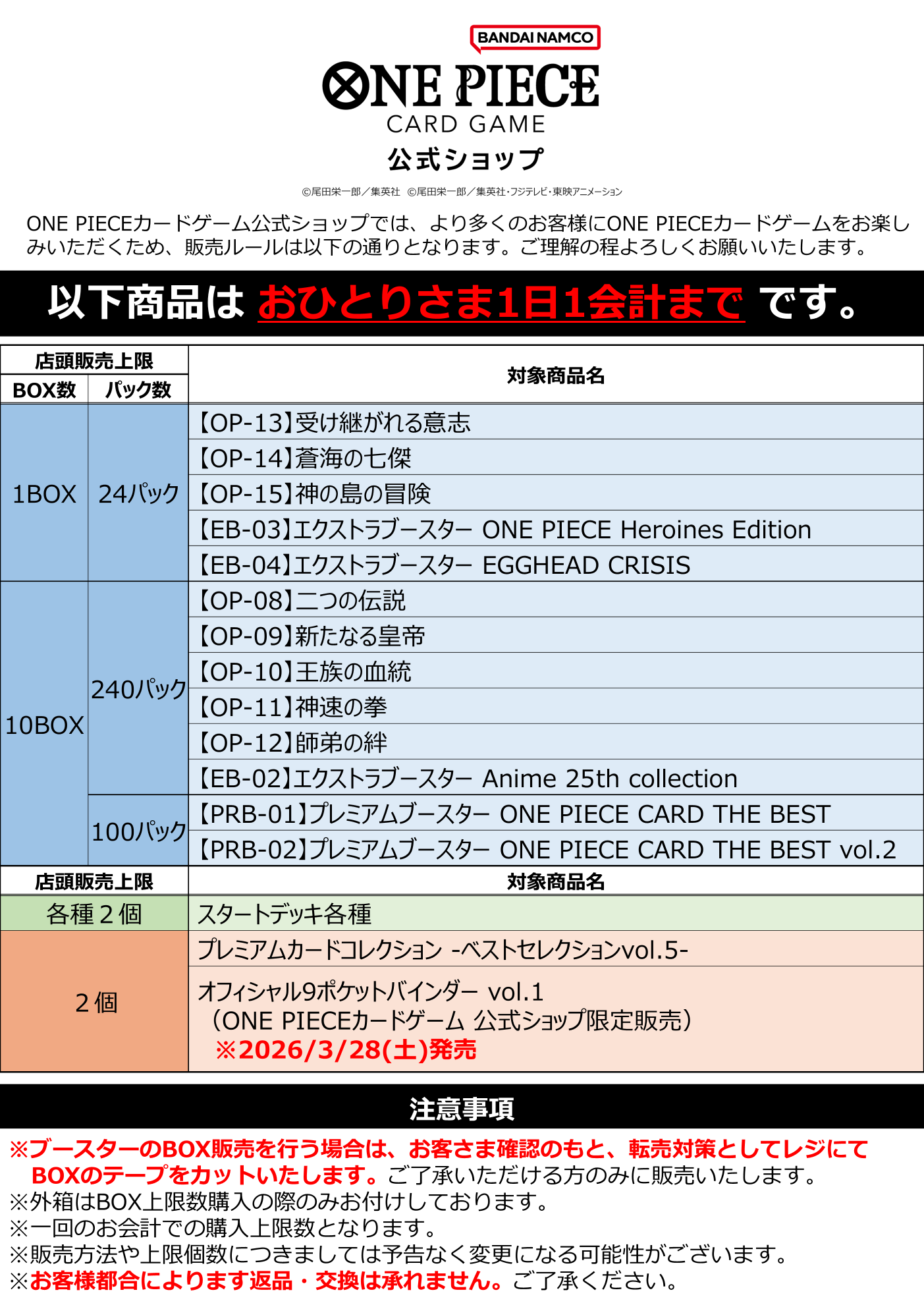 より多くのみなさまにお楽しみいただけるよう、ONE PIECEカードゲーム公式ショップでは一部商品に購入制限を設けております。