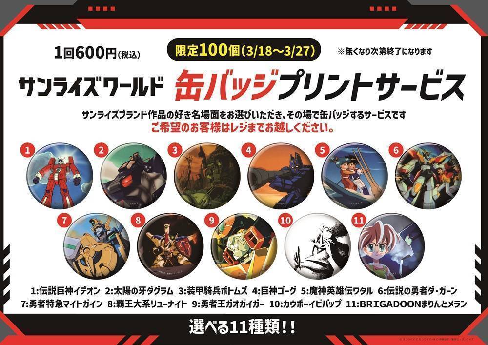 歴代のサンライズ作品をその場で缶バッジにする「カンマッチ」マシーンをバンダイナムコ Cross Store 横浜にて期間限定設置いたします。