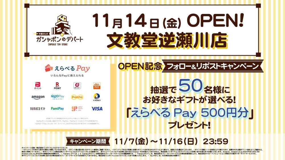 11/14(金)文教堂逆瀬川店がグランドオープン!これをリポストした方の中から抽選で50名さまに、「えらべるPay®」500円分がその場で当たる
