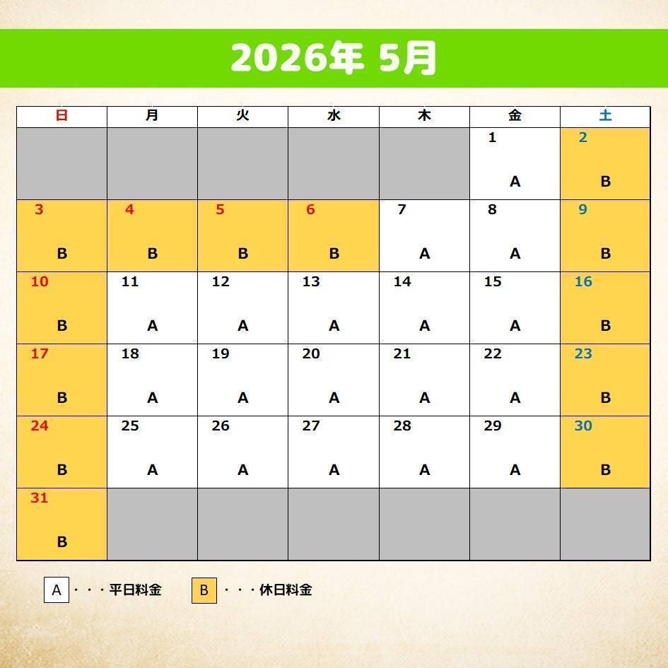 【料金カレンダー】2026年4月、5月分