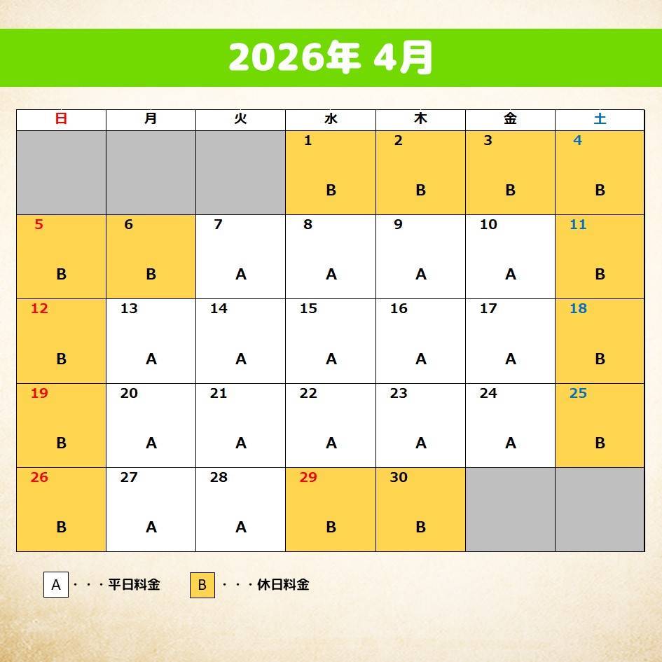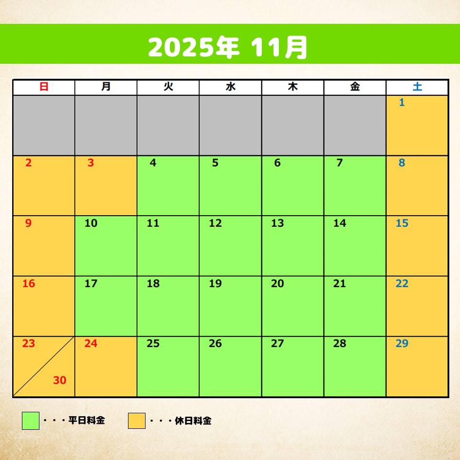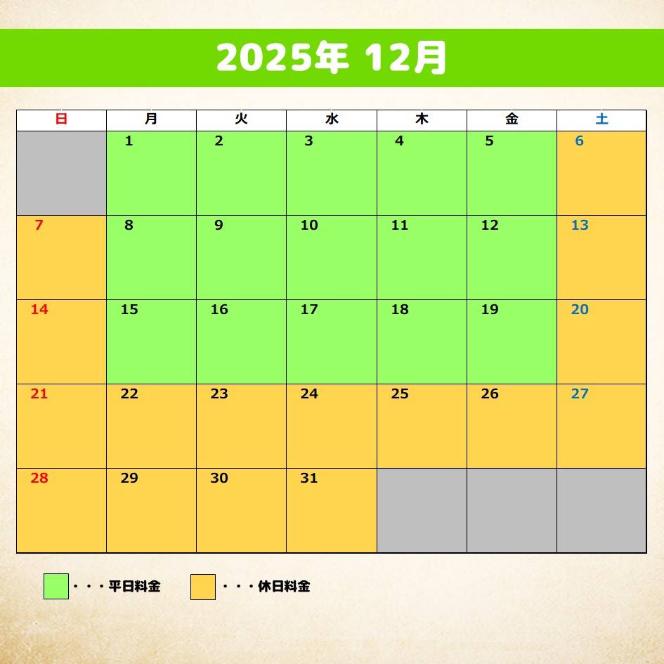平日でも「土日祝日・ハイシーズン料金」に該当する日がございます。
