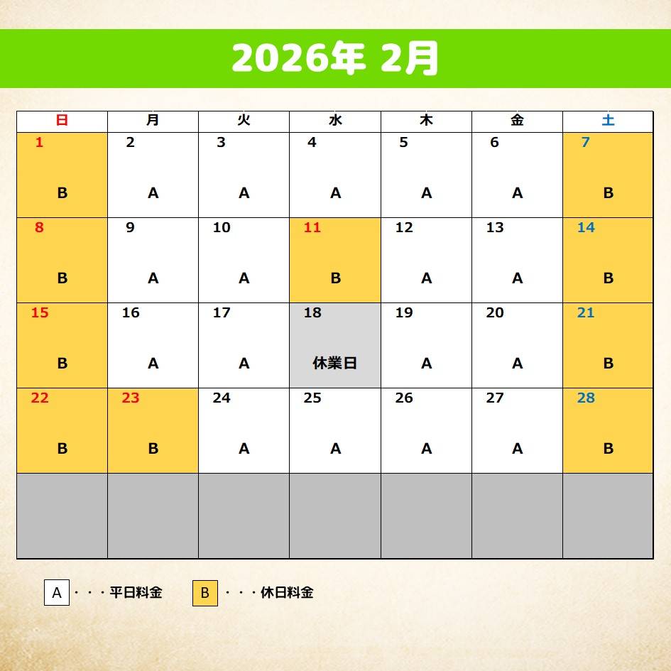 【料金カレンダー】2026年2月、3月分