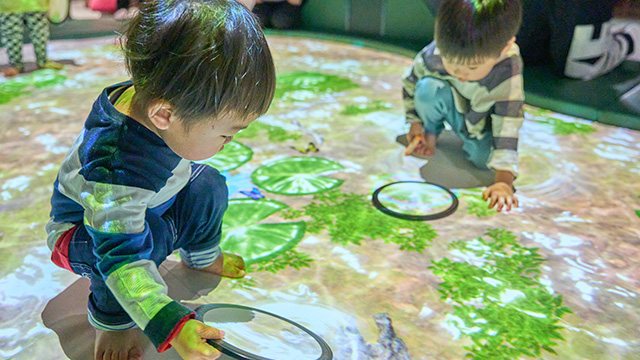 気持ち良いせせらぎに隠れた、珍しいカエルたち。あやしいところをムシメガネで覗くとピョンと跳びだすよ、つかまえよう!