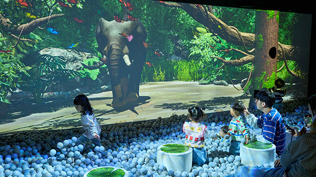 ゾウやカバは からだに泥をつけて、虫や太陽から肌を守ります。どろんこをすくいあげて たくさんかけてあげましょう。