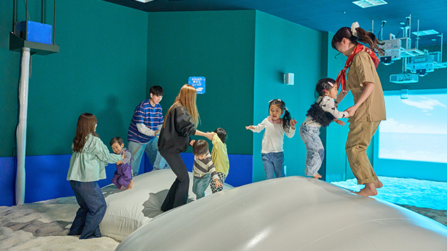 座ったり滑ったりすると水しぶきがあがるけど、濡れないから大丈夫。おもいきって滑り出そう、とってもきもちいいぞ!