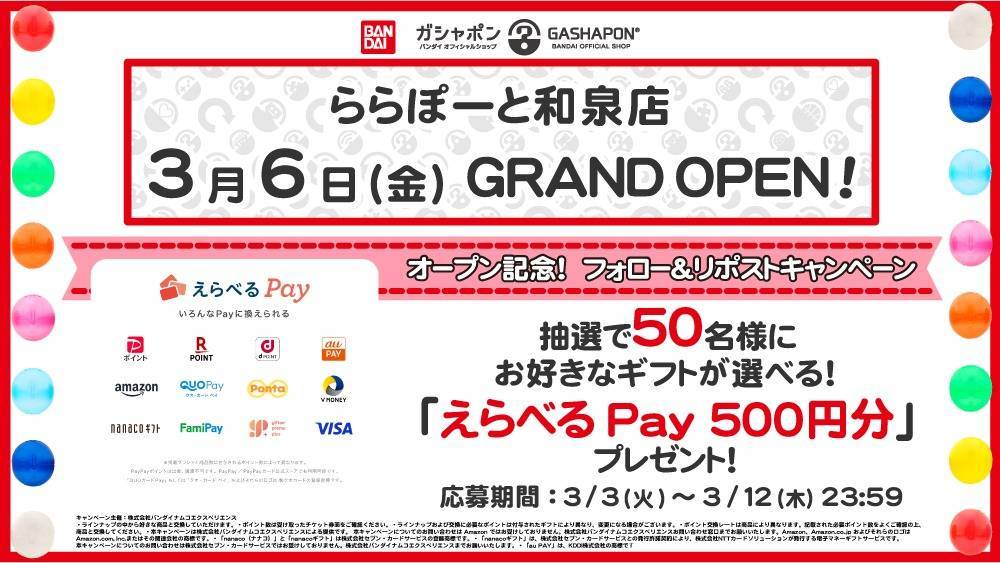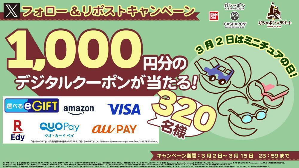 トピックスTopics カテゴリー すべて ららぽーと和泉店オープン記念!X(旧Twitter)フォロー&リポストキャンペーン2026.03.03 ~ 「選べるe-GIFT」1,000円分が320名さまに当たる! 3月2日(ミニチュアの日)に合わせてXキャンペーンを開催! 『ガシャポンバンダイオフィシャルショップ』『ガシャポンのデパート』公式Xフォロー&リポストキャンペーン!2026.02.20 ~ 梅田スカイビルタワーイースト 3F店オープン記念!X(旧Twitter)フォロー&リポストキャンペーン2026.02.20 ~ ガシャポンバンダイオフィシャルショップ梅田店 大規模リニューアルオープン2026.02.09 ~ 2,100円分の「 Uber Eats (ウーバーイーツ)ギフトカード」が210名さまに当たる! 2月10日(フードの日)に合わせてXキャンペーンを開催! 『ガシャポンバンダイオフィシャルショップ』『ガシャポンのデパート』公式Xフォロー&リポストキャンペーン!2026.02.03 ~ fumotto南アルプス店オープン記念!X(旧Twitter)フォロー&リポストキャンペーン2026.01.23 ~ イオンモール鳥取北店オープン記念!X(旧Twitter)フォロー&リポストキャンペーン2025.12.15 ~ TSUTAYA富山豊田店クリスマスプレゼントキャンペーン!X(旧Twitter)フォロー&リポストキャンペーン2025.12.12 ~ TSUTAYAWAYガーデンパーク和歌山店オープン記念!X(旧Twitter)フォロー&リポストキャンペーン2025.12.11 ~ アシーネ田辺店オープン記念!X(旧Twitter)フォロー&リポストキャンペーン2025.11.07 ~ 2025.11.16豊田KiTARA店オープン記念!X(旧Twitter)フォロー&リポストキャンペーン2025.12.05 ~ 2025.12.14古河あかやまJOY店オープン記念!X(旧Twitter)フォロー&リポストキャンペーン2025.09.26 ~ 2025.10.05イオンタウン読谷ショッピングセンター店オープン記念!X(旧Twitter)フォロー&リポストキャンペーン2025.09.05 ~ 2025.09.14イオンモール新利府南館店オープン記念!X(旧Twitter)フォロー&リポストキャンペーン2025.09.04 ~ 2025.09.13未来屋書店旭川シーナ店オープン記念!X(旧Twitter)フォロー&リポストキャンペーン2025.08.22 ~ 2025.08.31TSUTAYA二本松店オープン記念!X(旧Twitter)フォロー&リポストキャンペーン2025.08.01 ~ BOOKOFF岐阜オーキッドパーク店オープン記念!X(旧Twitter)フォロー&リポストキャンペーン2025.07.25 ~ 福山サービスエリア上り線店オープン記念!X(旧Twitter)フォロー&リポストキャンペーン2025.07.04 ~ ららぽーと海老名店オープン記念!X(旧Twitter)フォロー&リポストキャンペーン2025.06.13 ~ HYPERBOOKS×DELIGHT長浜店オープン記念!X(旧Twitter)フォロー&リポストキャンペーン2025.06.13 ~ ビッグワンTSUTAYA宇都宮竹林店オープン記念!X(旧Twitter)フォロー&リポストキャンペーン2025.06.04 ~ イオンシネマ板橋店オープン記念!X(旧Twitter)フォロー&リポストキャンペーン2025.05.20 ~ バンダイナムコアミューズメント限定商品情報2025.04.25 ~ アリオ倉敷店オープン記念!X(旧Twitter)フォロー&リポストキャンペーン2025.04.22 ~ mozoワンダーシティ店オープン記念!X(旧Twitter)フォロー&リポストキャンペーン2025.04.21 ~ ブックスジュピター店オープン記念!X(旧Twitter)フォロー&リポストキャンペーン2025.04.18 ~ 駿河屋梅田茶屋町店オープン記念!X(旧Twitter)フォロー&リポストキャンペーン2025.04.18 ~ ららぽーと愛知東郷店オープン記念!X(旧Twitter)フォロー&リポストキャンペーン2025.04.18 ~ TSUTAYA白河店オープン記念!X(旧Twitter)フォロー&リポストキャンペーン2025.04.17 ~ 2025.04.26イオンモール名取店オープン記念!X(旧Twitter)フォロー&リポストキャンペーン2025.04.11 ~ 2025.04.20PLANT出雲店オープン記念!X(旧Twitter)フォロー&リポストキャンペーン2025.04.07 ~ 2025.04.20HYPERBOOKS彦根店オープン記念!X(旧Twitter)フォロー&リポストキャンペーン2025.03.21 ~ 2025.03.30イオンタウン大館西店オープン記念!X(旧Twitter)フォロー&リポストキャンペーン2025.03.19 ~ ららぽーと磐田店オープン記念!X(旧Twitter)フォロー&リポストキャンペーン2025.03.18 ~ 2025.03.27宇部シネマスクエア7店オープン記念!X(旧Twitter)フォロー&リポストキャンペーン2025.03.12 ~ 2025.03.21駿河屋松山大街道店オープン記念!X(旧Twitter)フォロー&リポストキャンペーン2025.03.11 ~ 2025.03.20ガシャポンバンダイオフィシャルショップ@TOKYO STATIONオープン2025.03.07 ~ ウイングベイ小樽店オープン記念!X(旧Twitter)フォロー&リポストキャンペーン2025.02.27 ~ 2025.03.08未来屋書店加西北条店オープン記念!X(旧Twitter)フォロー&リポストキャンペーン2025.02.27 ~ 2025.03.08ミスターマックス宇佐店オープン記念!X(旧Twitter)フォロー&リポストキャンペーン2025.02.14 ~ 2025.02.23ガシャポンバンダイオフィシャルショップ池袋店・さっぽろ東急百貨店限定! 3週連続来店で景品プレゼント♪2025.02.17 ~ 2025.03.09TSUTAYA太子店オープン記念!X(旧Twitter)フォロー&リポストキャンペーン2025.02.06 ~ 2025.02.15未来屋書店浜松市野店オープン記念!X(旧Twitter)フォロー&リポストキャンペーン2025.01.30 ~ 2025.02.08未来屋書店姶良店オープン記念!X(旧Twitter)フォロー&リポストキャンペーン2025.01.23 ~ 2025.02.01未来屋書店北浦和店オープン記念!X(旧Twitter)フォロー&リポストキャンペーン2025.01.09 ~ バンダイナムコアミューズメント限定商品情報2024.12.20 ~ 未来屋書店酒田