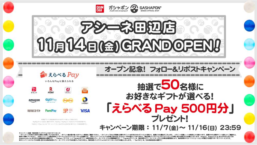 対象アカウントをフォローしてキャンペーンポストをリポストした方の中から抽選で50名さまに、「えらべるPay®」500円分がその場で当たる