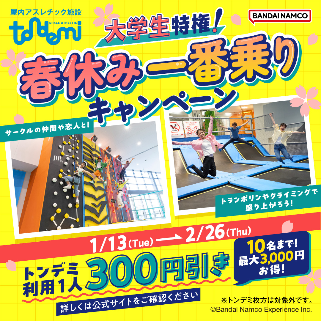 トンデミ では、1/13(火)~2/26(木)の期間中、大学生が遊ぶとトンデミ利用料1人あたり300円引きの