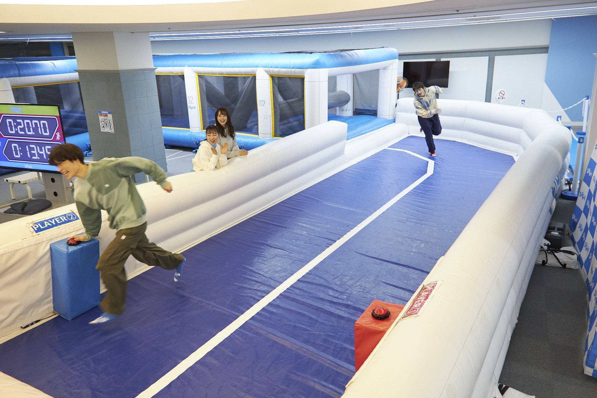 空気で膨らんだ障害物コースをよじ登ったり、くぐったりしてゴールを目指す爽快アクティビティ。