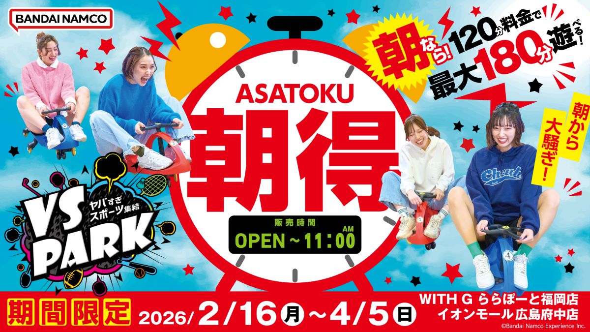 『VS PARK WITH G ららぽーと福岡店』『VS PARK イオンモール広島府中店』では2026年2月16日(月)~4月5日(日)の期間、オープン~11時限定でお得な「朝得」チケットを販売します! 120分料金そのまま180分も遊べる お得なチケットです!