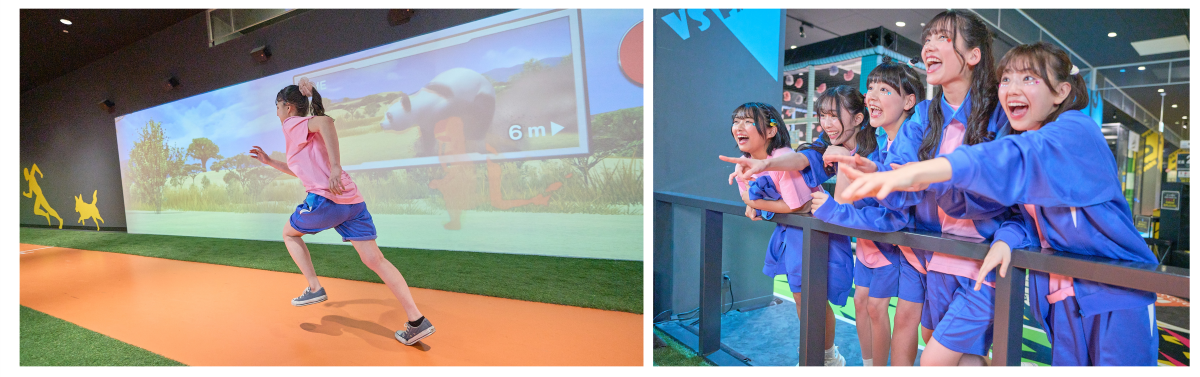 (写真左) 正面から迫りくる猛獣の大群を、左右に動いてよけまくれ!4人まで同時体験可能。