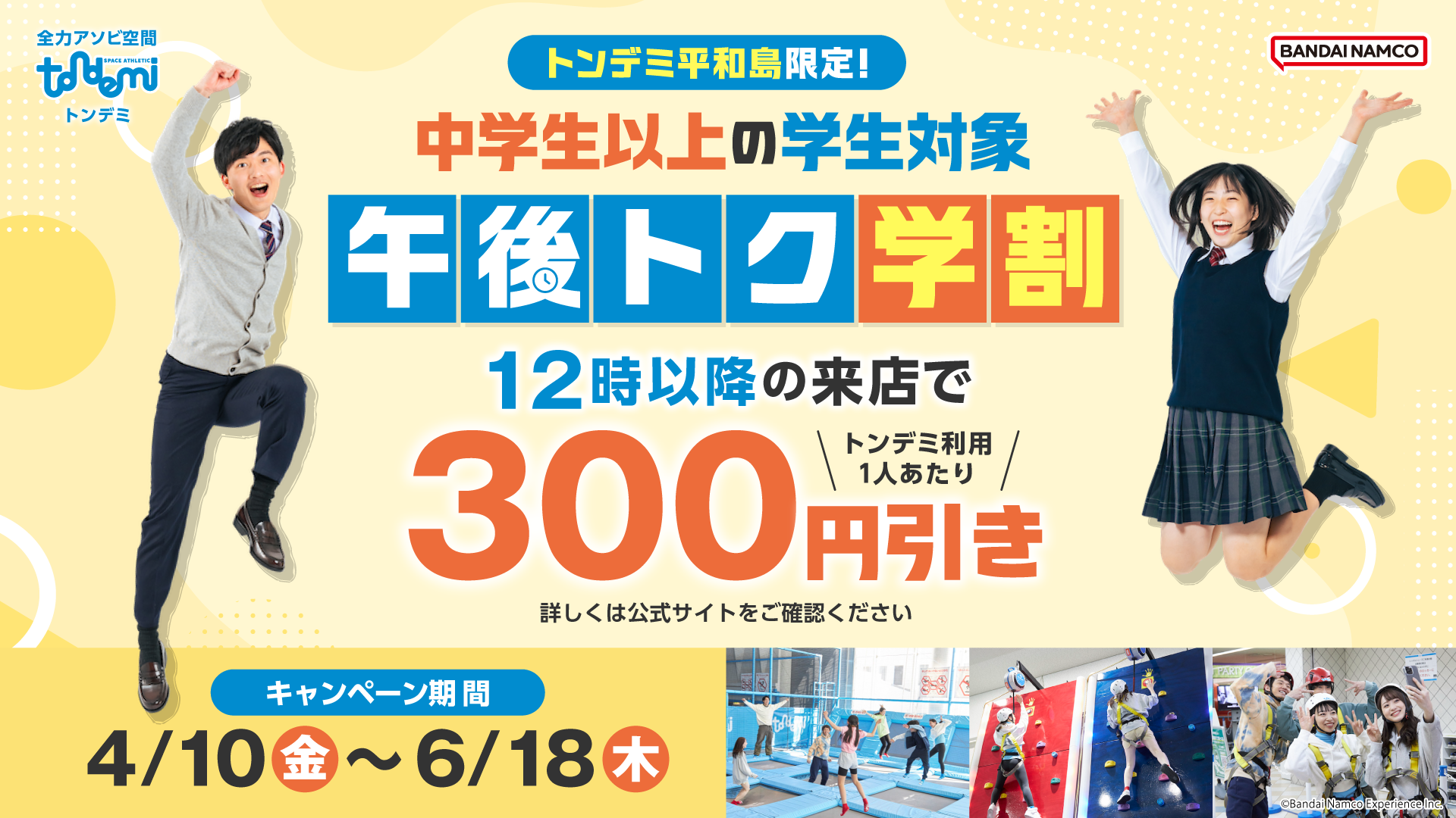 店舗トピックス 4/10(金)~ 中学生以上の学生必見!!12時以降はトンデミ利用料が300円引きの「午後トク学割」♪