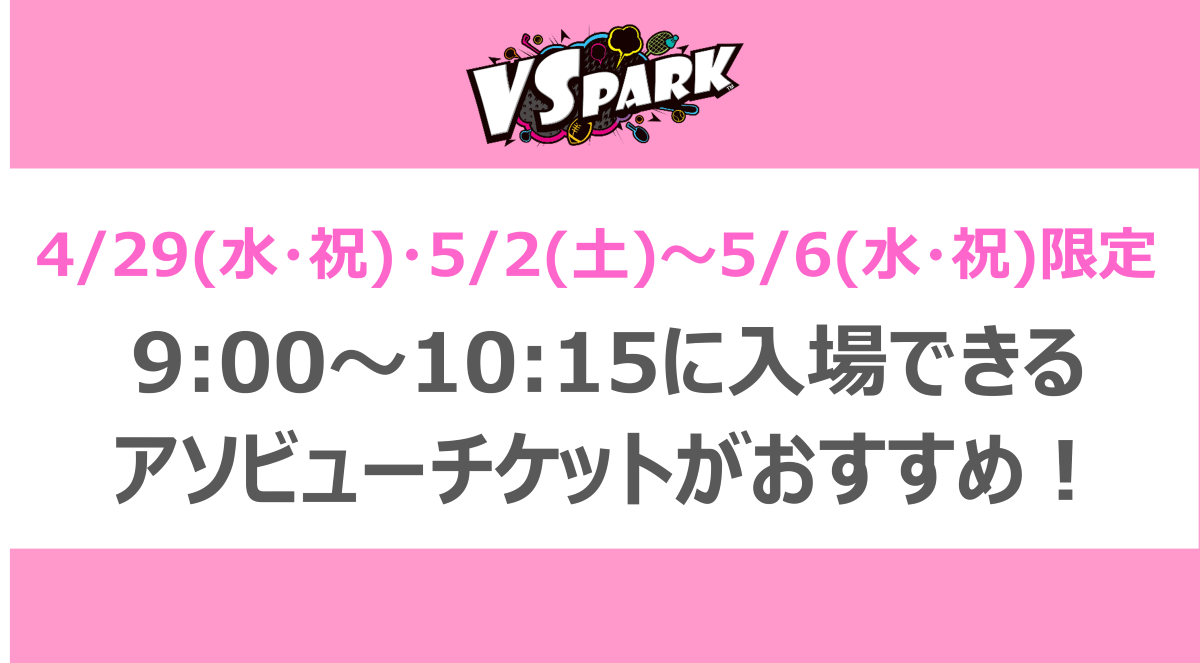 店舗トピックス 4/29(水・祝)、5/2(土)~5/6(水・祝)は9:00の回アソビューチケットがおすすめ! 【重要】入場時間が9:00~10:15の枠のWEBチケットをご購入のお客様へ
