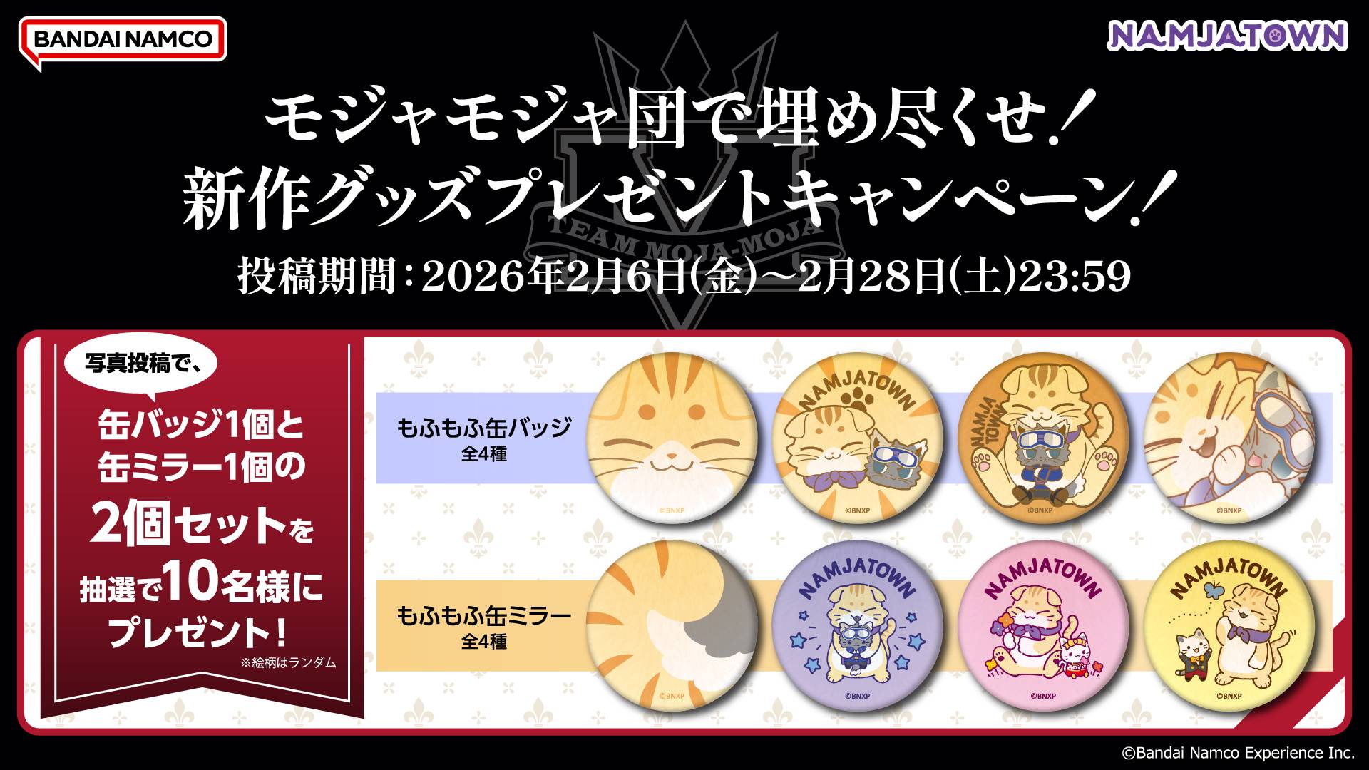 株式会社バンダイナムコエクスペリエンス(以下、当社といいます)は、当社が日本国内向けに実施する「モジャモジャ団で埋め尽くせ!新作グッズプレゼントキャンペーン!」(以下、本キャンペーンといいます)の適正かつ円滑な運営のため、本キャンペーンの応募規約(以下、本規約といいます)を以下のとおり定めます。