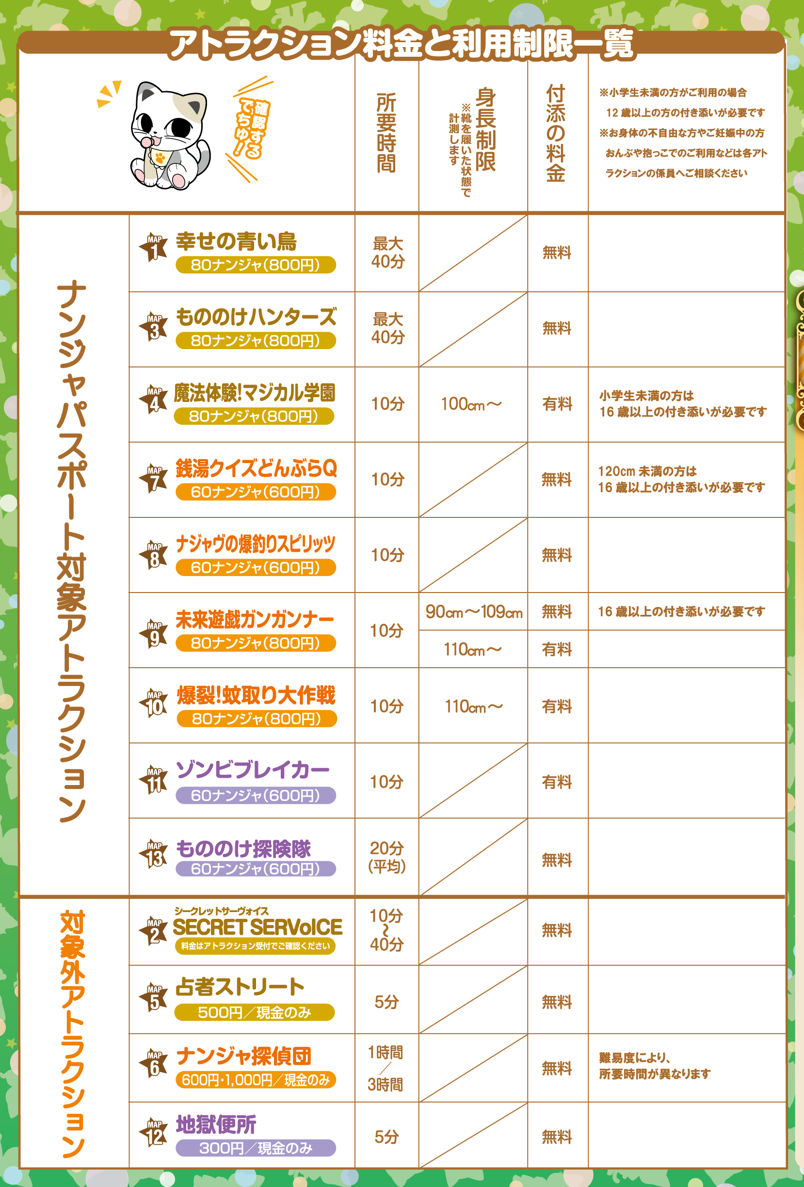 | 次世代ニンジャアトラクションe-Ninja | 100ナンジャ(1,000円) | ○ | 約10分 | ― | 小学生未満の方がご利用の場合は、13歳以上の保護者の同行が必要です。4歳以上からご利用いただけます。 |