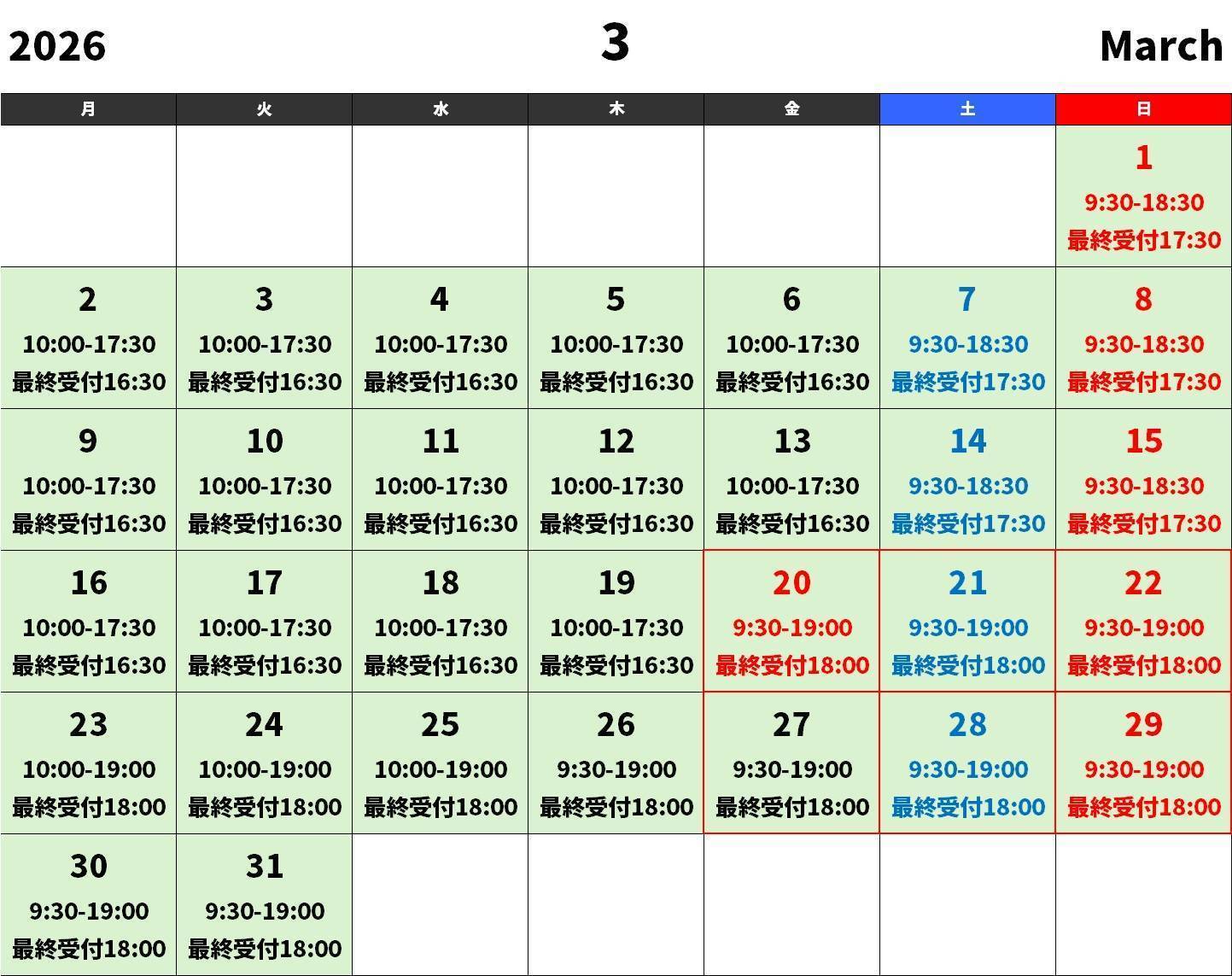 ご来店前に下記カレンダーと詳細をご確認ください。